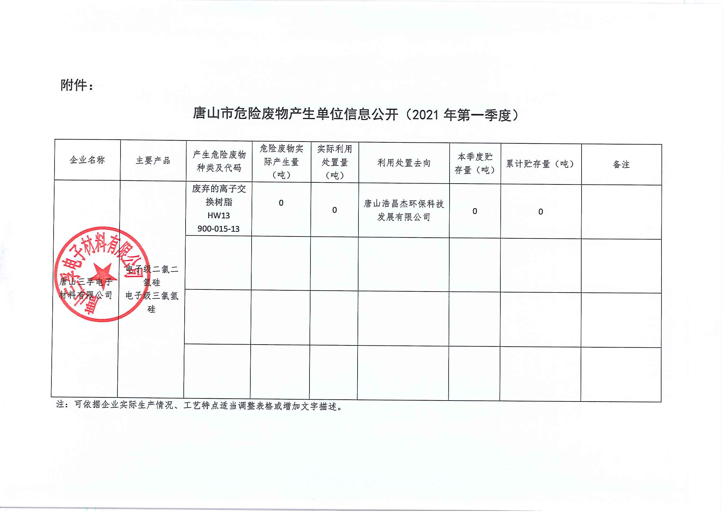 唐山三孚電子材料有限公司2021年1季度危險(xiǎn)廢物產(chǎn)生單位信息公開