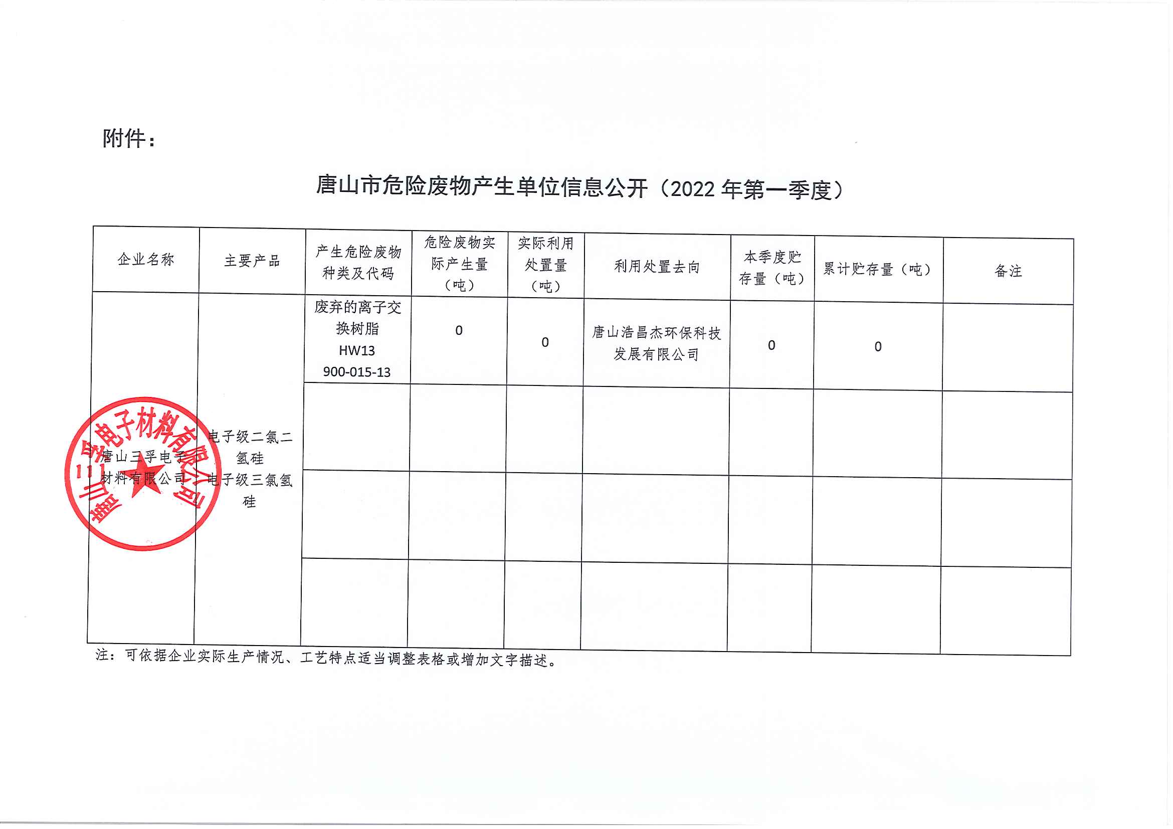 唐山三孚電子材料有限公司2022年一季度一般固廢信息公開