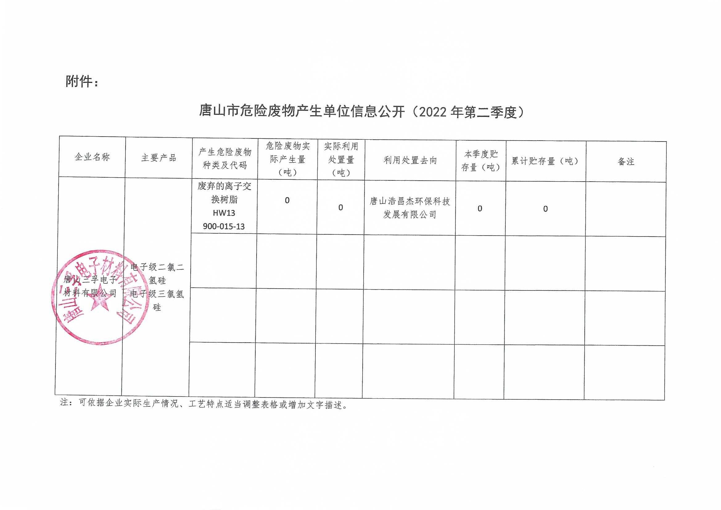 唐山三孚電子材料有限公司2022年二季度危險(xiǎn)廢物信息公開(kāi)