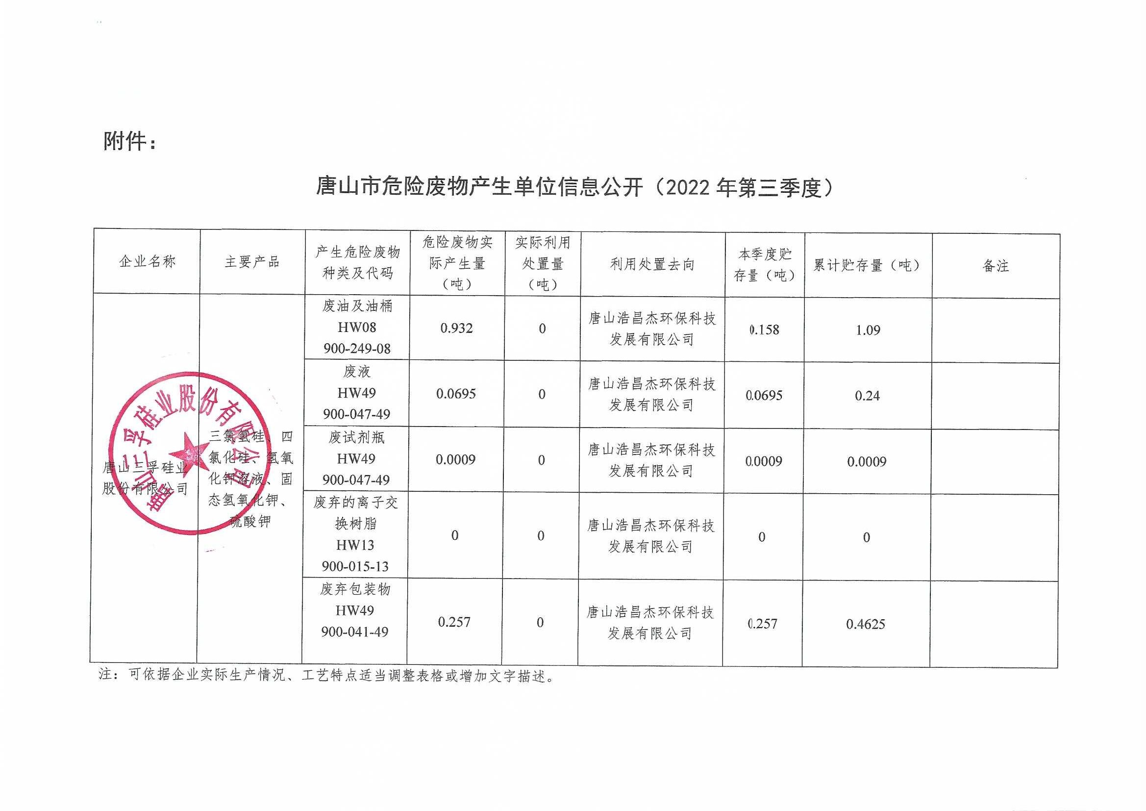 唐山三孚硅業股份有限公司2022年第三季度危險廢物信息公開